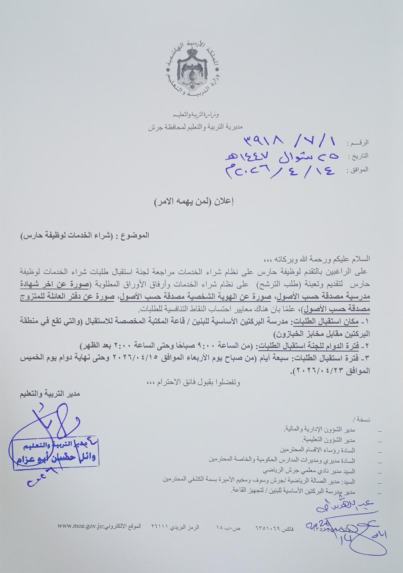 تعلن مديرية التربية والتعليم لمحافظة جرش عن رغبتها في تعيين حراس (ذكور) على نظام شراء الخدمات لمدة عام واحد، لسد النقص في المدارس الأكثر حاجة، وذلك براتب شهري مقداره 350 دينار).