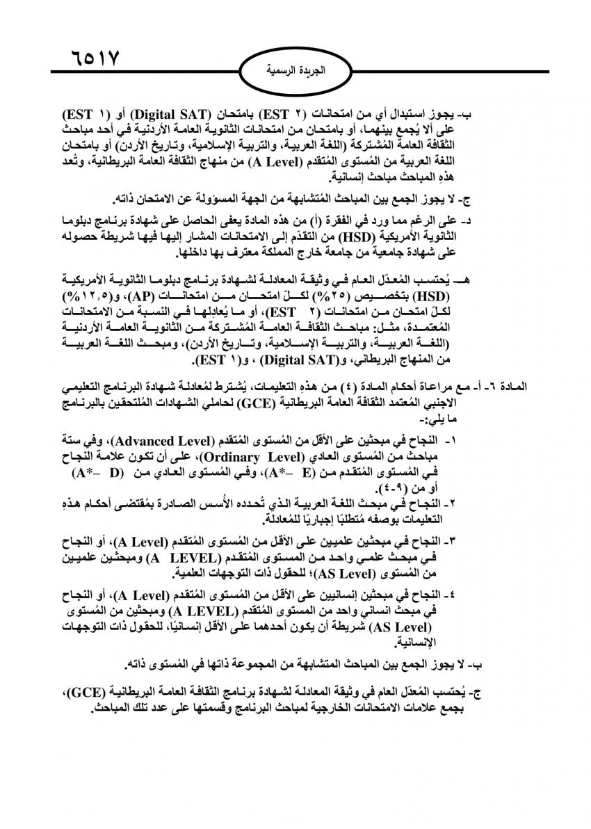 وجاءت التعليمات بمقتضى الفقرة (د) من المادة (1) والمادتين (٩) و(15) من نظام معادلة الشهادات من مستوى شهادة الدراسة الثانوية العامة رقم (69) لسنة ٢٠١٣.