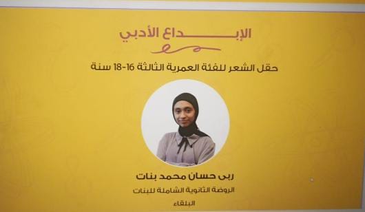 جو أكاديمي - شادي نبيل - سجلت مديرية التربية والتعليم للواء الشونة الجنوبية إنجازاً وطنياً جديداً، حيث فازت الطالبة ربى حسان بنات من مدرسة الروضة الثانوية الشاملة للبنات بـ المركز الأول في مجال الإبداع الأدبي/حقل الشعر، ضمن الفئة العمرية (16–18 سنة)، وذلك في جائزة عبد الحميد شومان للإنتاج الإبداعي للأطفال واليافعين (أبدع) لدورتها التاسعة عشرة لعام 2025.